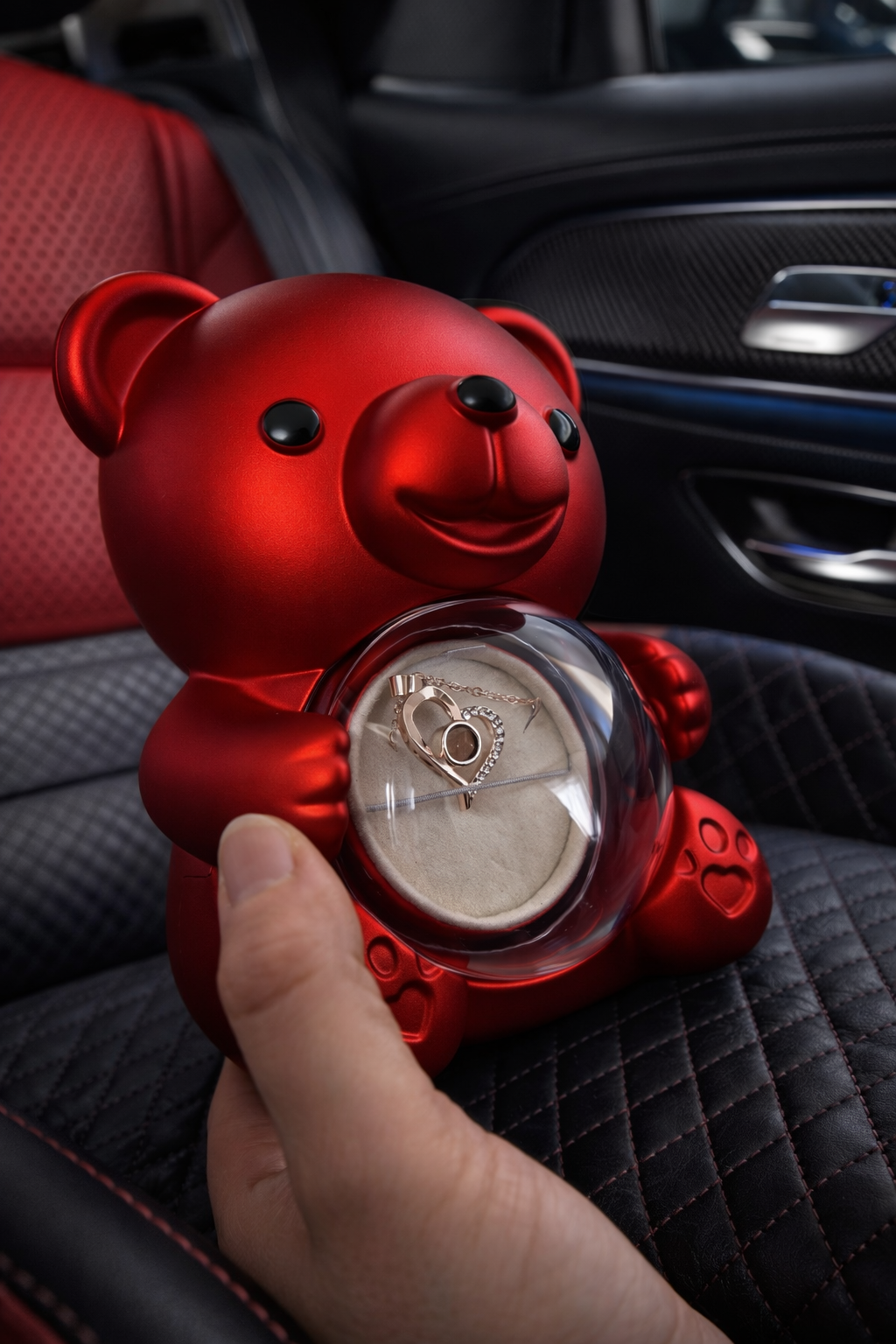 Tai miela ir originali dovana, kuri spinduliuoja elegancija ir sentimentalumu. Šį žavų meškiuką puošia ne tik rožės žiedas viduje, bet jame slypi ir staigmena: pasukus jį atsiveria paslėptas papuošalų skyrius, kuriame rasite grandinėlę. Tai paverčia šią dovaną išskirtine ir prasminga.