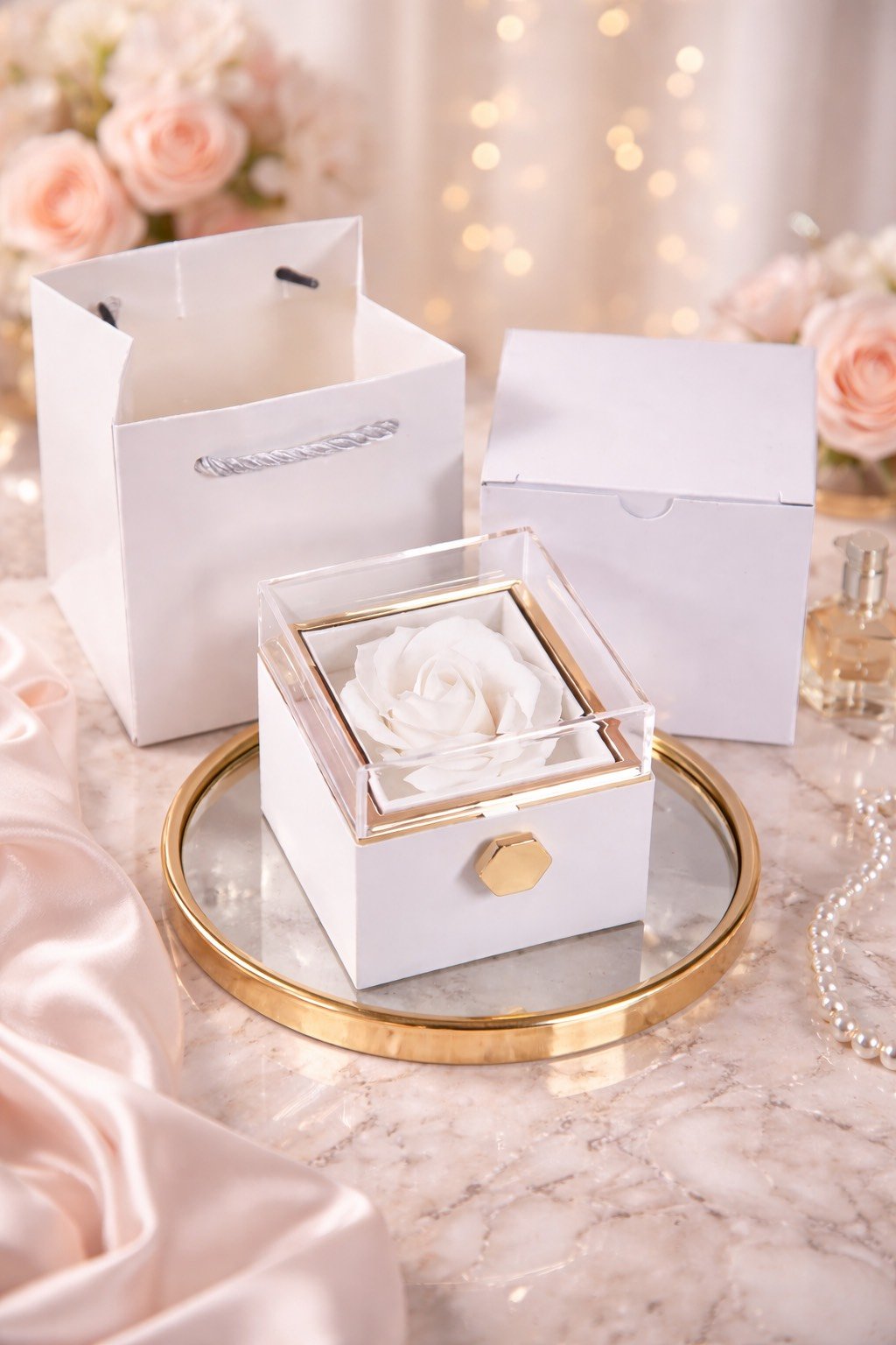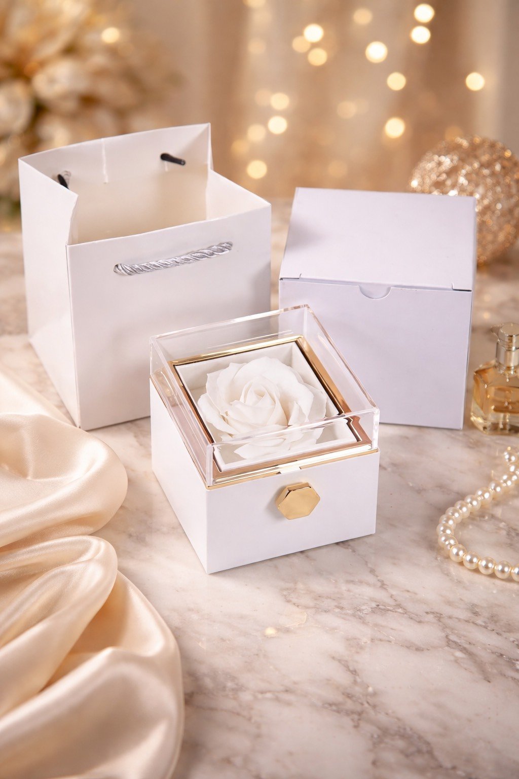 - Balta dėžutė su miegančios rožės žiedu